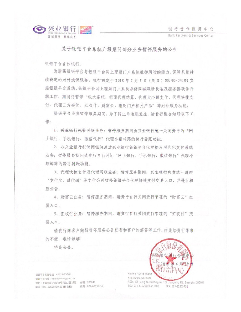 轉(zhuǎn)發(fā)關(guān)于《銀銀平臺(tái)系統(tǒng)升級(jí)期間部分業(yè)務(wù)暫停服務(wù)的公告》 日期:2018-07-06 09:24:15 上一篇 返回 下一篇