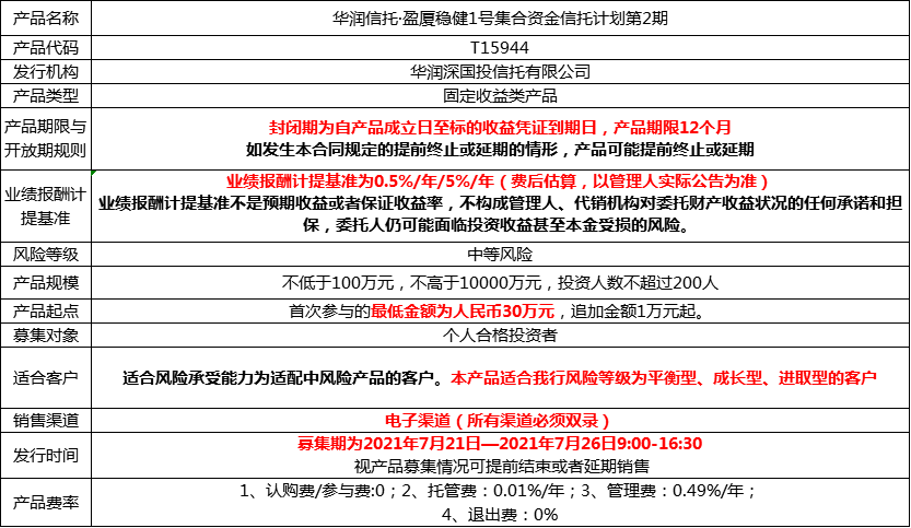 我行于2021年7月代銷《華潤(rùn)信托-盈廈穩(wěn)健1號(hào)集合資金信托計(jì)劃第2期》,產(chǎn)品信息如下:
