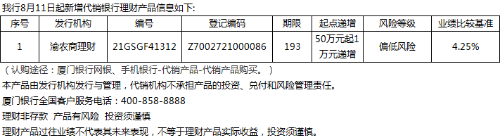 廈門銀行8月11日代銷渝農(nóng)商理財理財產(chǎn)品信息