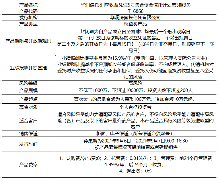 我行于2021年9月代銷《華潤信托·潤享收益憑證5號集合資金信托計劃第3期B類》,產(chǎn)品信息如下: