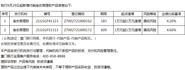 廈門銀行9月29日代銷渝農(nóng)商理財產(chǎn)品信息