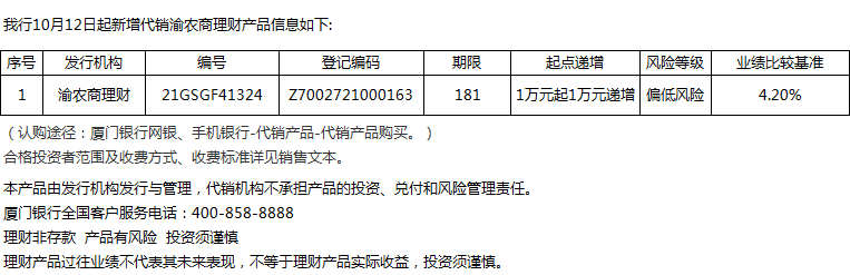 廈門銀行10月12日代銷渝農(nóng)商理財(cái)產(chǎn)品信息