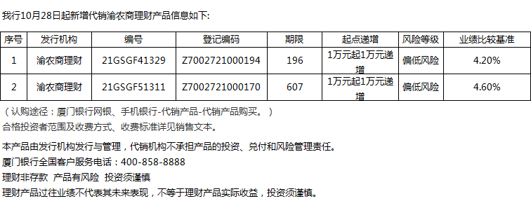 廈門(mén)銀行10月28日代銷(xiāo)渝農(nóng)商理財(cái)產(chǎn)品信息