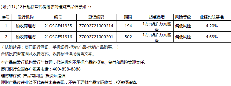 廈門銀行11月18日代銷渝農(nóng)商理財產(chǎn)品信息