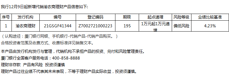 廈門銀行12月9日代銷渝農(nóng)商理財(cái)產(chǎn)品信息