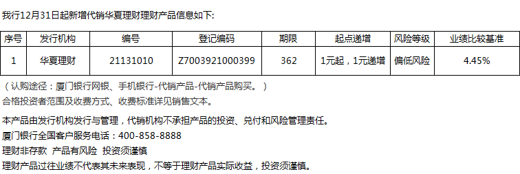 廈門銀行12月31日代銷華夏理財理財產(chǎn)品信息