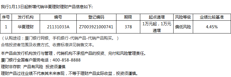 廈門銀行1月13日代銷華夏理財理財產(chǎn)品信息