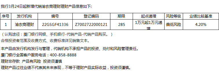 廈門(mén)銀行3月24日代銷(xiāo)渝農(nóng)商理財(cái)理財(cái)產(chǎn)品信息