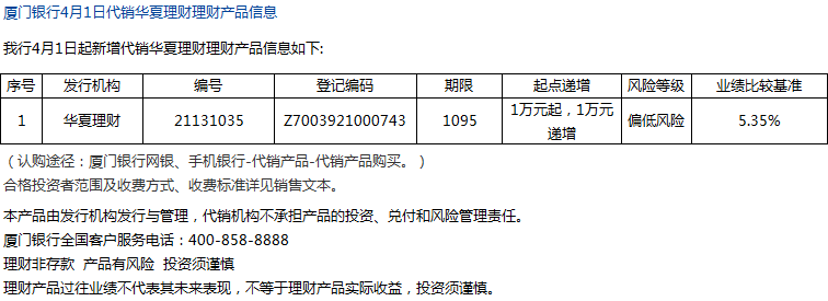 廈門(mén)銀行4月1日代銷(xiāo)華夏理財(cái)理財(cái)產(chǎn)品信息