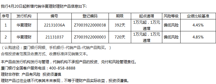 廈門銀行4月20日代銷華夏理財(cái)理財(cái)產(chǎn)品信息