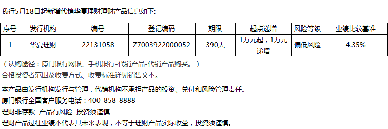 廈門(mén)銀行5月18日代銷(xiāo)華夏理財(cái)理財(cái)產(chǎn)品信息
