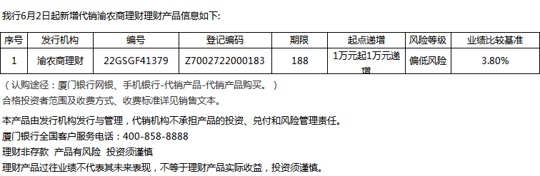廈門銀行6月2日代銷渝農(nóng)商理財理財產(chǎn)品信息
