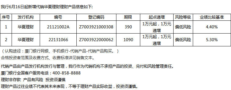 廈門銀行6月16日代銷華夏理財理財產品信息