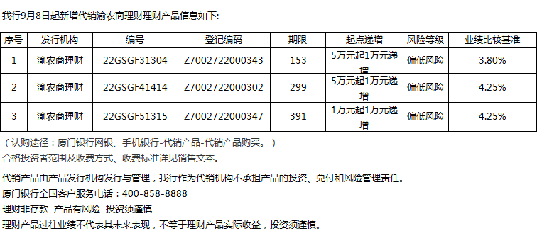 廈門銀行9月8日代銷渝農(nóng)商理財理財產(chǎn)品信息