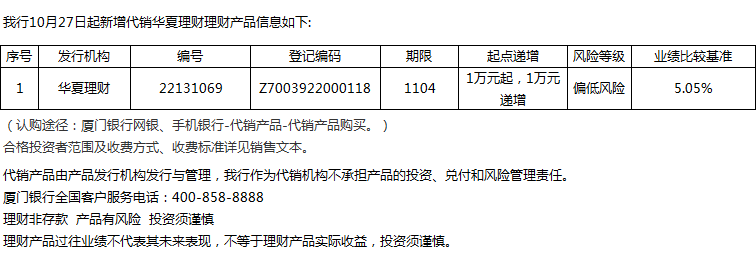 廈門銀行10月27日代銷華夏理財理財產(chǎn)品信息