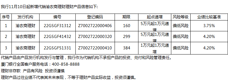廈門銀行11月10日代銷渝農(nóng)商理財理財產(chǎn)品信息