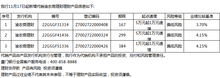 廈門銀行11月17日代銷渝農商理財理財產品信息