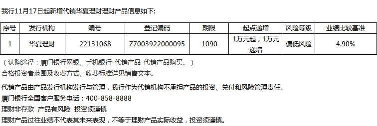 廈門(mén)銀行11月17日代銷華夏理財(cái)理財(cái)產(chǎn)品信息