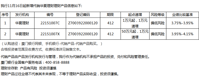 廈門銀行11月16日代銷華夏理財理財產(chǎn)品信息