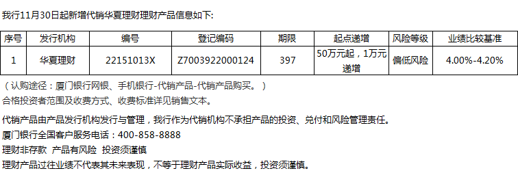 廈門銀行11月30日代銷華夏理財理財產(chǎn)品信息