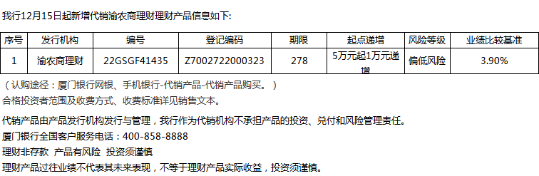 廈門(mén)銀行12月15日代銷(xiāo)渝農(nóng)商理財(cái)理財(cái)產(chǎn)品信息