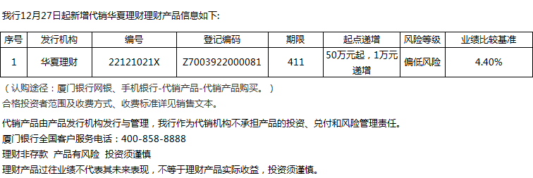 廈門銀行12月27日代銷華夏理財(cái)理財(cái)產(chǎn)品信息