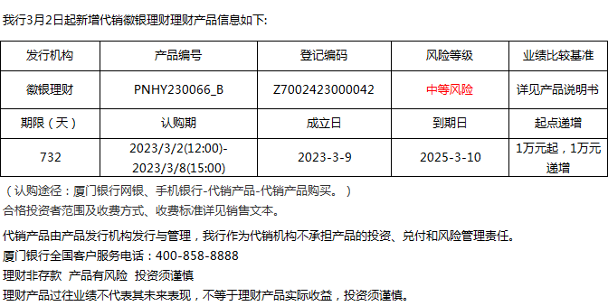 廈門銀行3月2日代銷徽銀理財理財產(chǎn)品信息