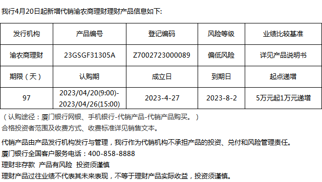 廈門銀行4月20日代銷渝農(nóng)商理財(cái)理財(cái)產(chǎn)品信息