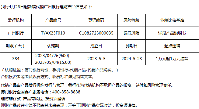 廈門(mén)銀行4月26日代銷(xiāo)廣州銀行理財(cái)產(chǎn)品信息