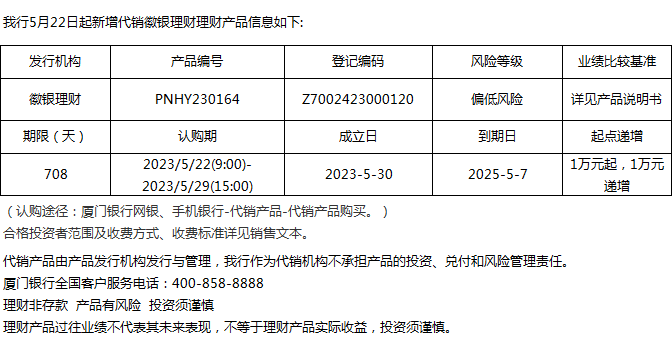 廈門銀行5月22日代銷徽銀理財理財產(chǎn)品信息