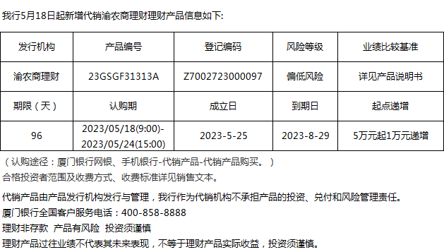 廈門銀行5月18日代銷渝農(nóng)商理財(cái)理財(cái)產(chǎn)品信息
