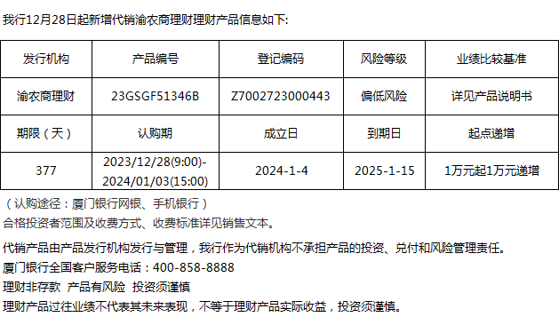 廈門(mén)銀行12月28日代銷(xiāo)渝農(nóng)商理財(cái)理財(cái)產(chǎn)品信息