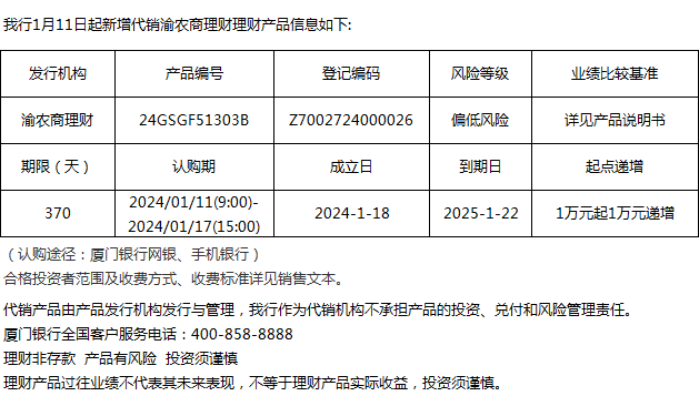 廈門銀行1月11日代銷渝農(nóng)商理財理財產(chǎn)品信息