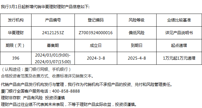 廈門銀行3月1日代銷華夏理財(cái)理財(cái)產(chǎn)品信息