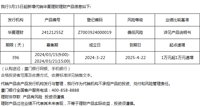 廈門(mén)銀行3月15日代銷(xiāo)華夏理財(cái)理財(cái)產(chǎn)品信息