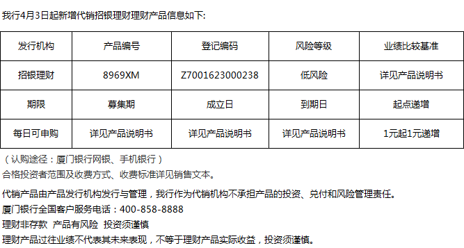 廈門銀行4月3日代銷招銀理財(cái)理財(cái)產(chǎn)品信息