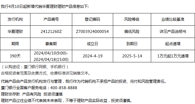 廈門銀行4月10日代銷華夏理財理財產品信息