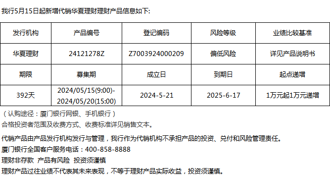 廈門銀行5月15日代銷華夏理財理財產(chǎn)品信息