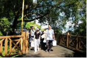 早上的蓮花山清風(fēng)徐徐,木棧道如一條蜿蜒的絲帶鑲嵌在青山之間。分行員工們身著輕便裝束,精神抖擻地踏上健步之旅。