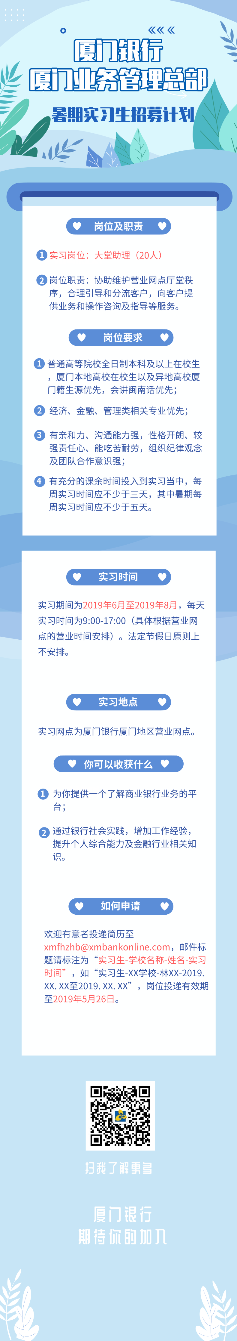 廈門銀行暑期實習生招募計劃現(xiàn)已啟動,快來投簡歷吧!