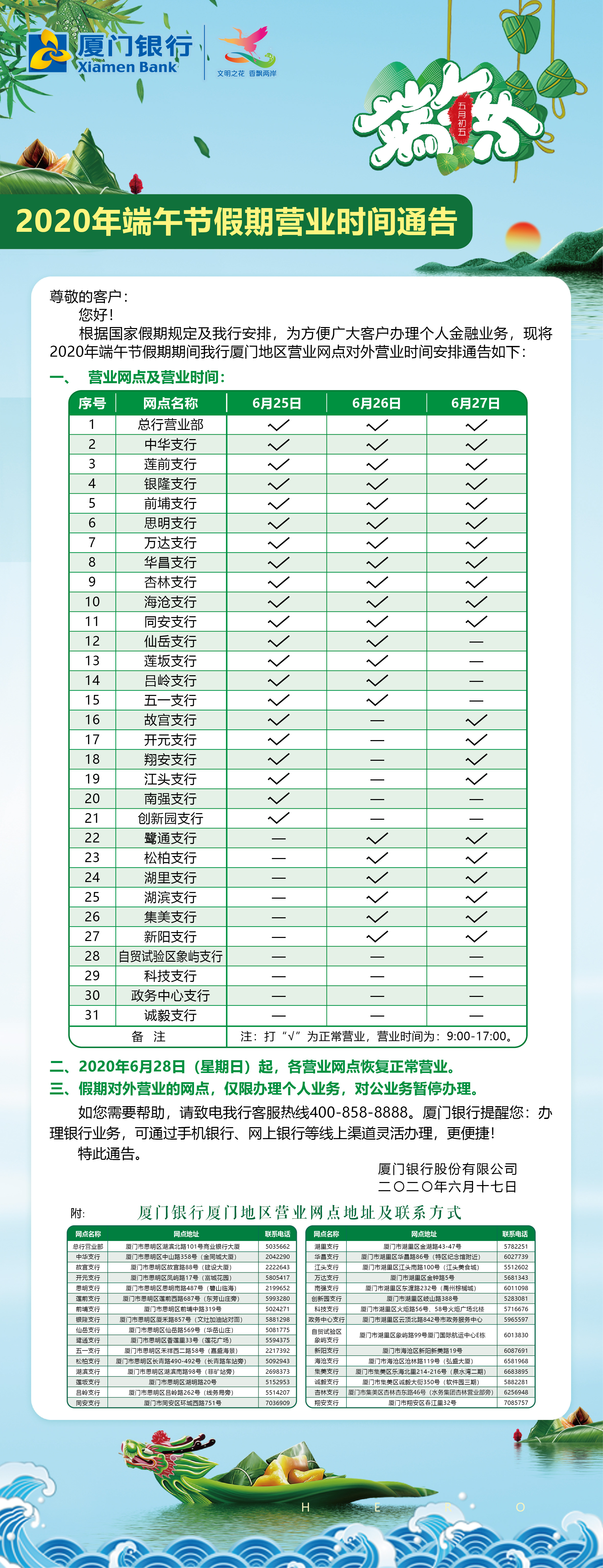 廈門銀行廈門地區(qū)營業(yè)網(wǎng)點(diǎn)2020年端午節(jié)假期營業(yè)時(shí)間通告