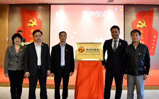 海滄區(qū)委組織部副部長、區(qū)委非公工委副書記葉偉民(左三)與廈門銀行海滄支行黨支部書記、新陽支行行長林锽钅泉(右二)共同為廈門銀行海滄支行黨支部黨建品牌揭牌。