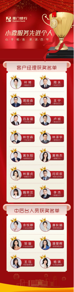 這些沉甸甸的榮譽離不開廈門銀行前中后臺眾多小微金融服務(wù)人員的執(zhí)著堅守與默默付出。近日,為表彰先進、樹立榜樣,廈門銀行開展了小微企業(yè)金融服務(wù)先進個人評選活動。下面,讓我們來看看這些上榜人員的風(fēng)采吧。