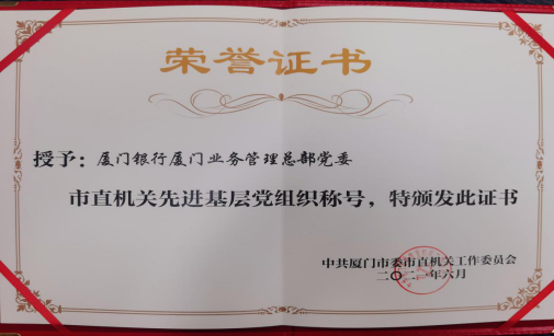 喜報!中共廈門銀行廈門業(yè)務(wù)管理總部委員會獲“廈門市直機關(guān)先進基層黨組織”稱號