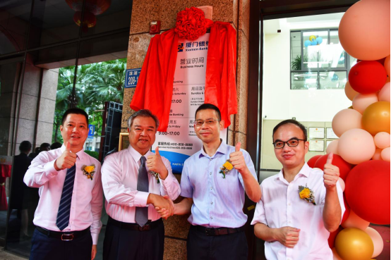 (廈門海滄臺商投資區(qū)管委會副主任章春杰、海滄區(qū)財政局局長何良鑫、廈門銀行行長吳昕顥以及海發(fā)支行行長王寧共同為支行開業(yè)揭牌)