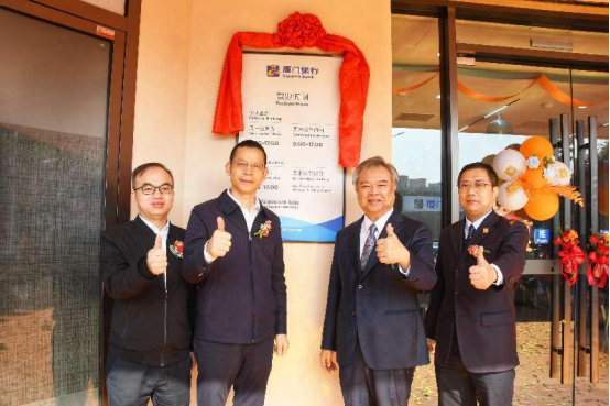 廈門市海滄區(qū)委常委、海滄臺(tái)商投資區(qū)管委會(huì)副主任章春杰,海滄區(qū)財(cái)政局局長何良鑫,廈門銀行行長吳昕顥,廈門銀行海滄業(yè)務(wù)部總經(jīng)理劉權(quán)共同為支行揭牌