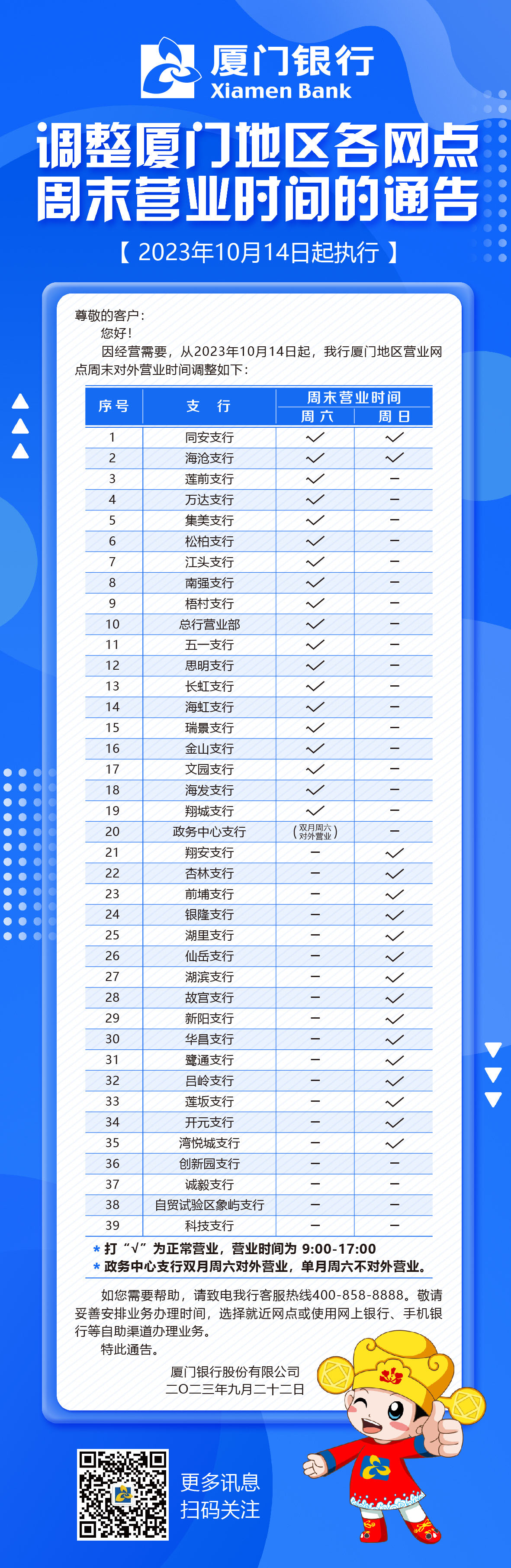 廈門銀行關(guān)于調(diào)整廈門地區(qū)各網(wǎng)點(diǎn)周末營業(yè)時(shí)間的通告