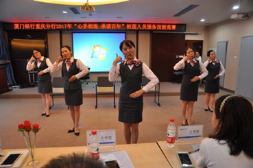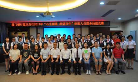 為慶祝廈門(mén)銀行重慶分行成立6周年,重慶分行工會(huì)委員會(huì)聯(lián)合分行營(yíng)運(yùn)管理部,圍繞“立足營(yíng)運(yùn) 助力營(yíng)銷(xiāo)”的經(jīng)營(yíng)理念,于6月10日開(kāi)展了重慶分行2017年“心手相連 承諾百年”柜面服務(wù)技能競(jìng)賽。分行行領(lǐng)導(dǎo)、各部門(mén)負(fù)責(zé)人,以及營(yíng)運(yùn)條線共41名柜面人員參加了本次競(jìng)賽活動(dòng)。競(jìng)賽項(xiàng)目包括業(yè)務(wù)技能競(jìng)賽、營(yíng)運(yùn)業(yè)務(wù)知識(shí)競(jìng)賽、服務(wù)禮儀情景展示。