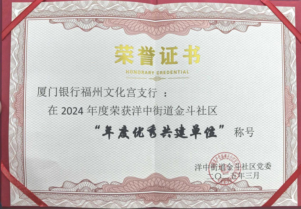 3月21日上午,福州文化宮支行受邀參加洋中街道金斗社區(qū)舉行的“紅色引擎 三治聚力”金斗社區(qū)2025年黨建聯(lián)盟座談會,并榮獲“2024年度優(yōu)秀共建單位稱號”。