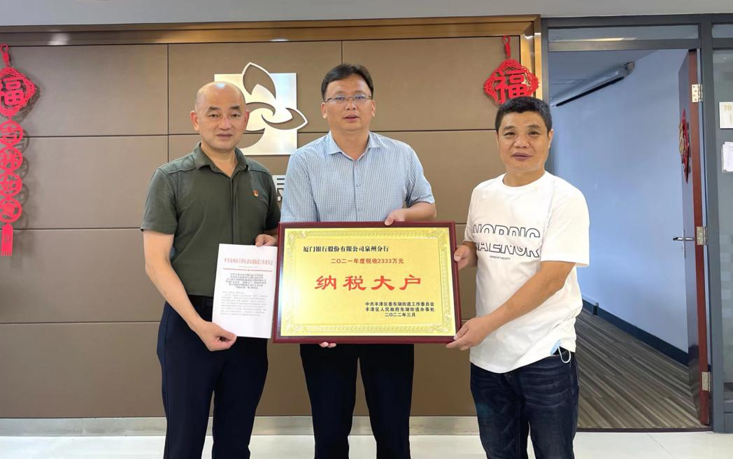 2022年6月6日,泉州分行以2021年度納稅2333萬元人民幣的成績獲得中共豐澤區(qū)委東湖街道工作委員會及豐澤區(qū)人民政府東湖街道辦事處授予“納稅大戶”榮譽表彰。